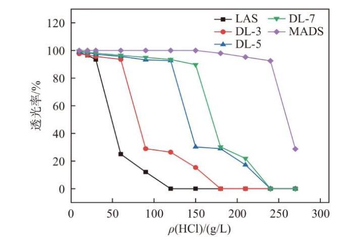 配制10 g/L的待测表面活性剂溶液,向玻璃样口瓶中加入1 mL表面活性剂溶液,再分别加入不同质量浓度的盐酸溶液,最后用蒸馏水补至10 mL。摇匀静置一夜,在25℃下用Cary5000分光光度计对溶液进行透光率的测量。