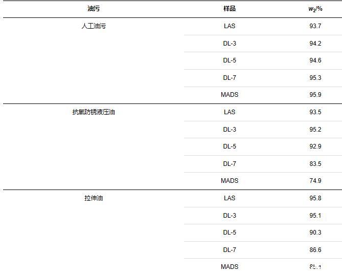 金属净洗力是指表面活性剂溶液在金属表面去除污垢、油脂或其他污染物的能力,表面活性剂的金属净洗力直接影响其在工业清洗中的效果[12,13]。本研究选择人工油污、抗氧防锈液压油以及拉伸油模拟不同的工业场景,探究其对LAS、DL-n系列、MADS表面活性剂溶液净洗力的影响。实验结果如表4所示,可以看出:对于人工油污,随着混合磺酸盐中MADS含量的增多,净洗力整体差异不大,都维持在90%以上;对于抗氧防锈液压油与拉伸油,随着混合磺酸盐中MADS含量的增多,表面活性剂溶液亲水性增加,对抗氧防锈液压油、拉伸油乳化能力下降,净洗力逐渐降低。