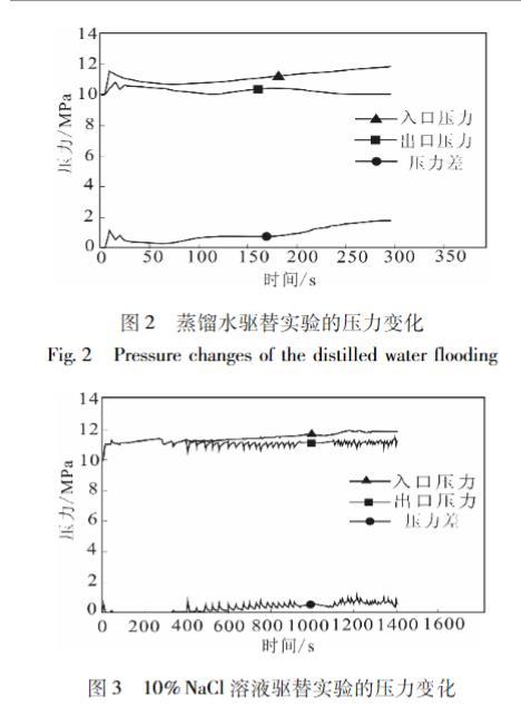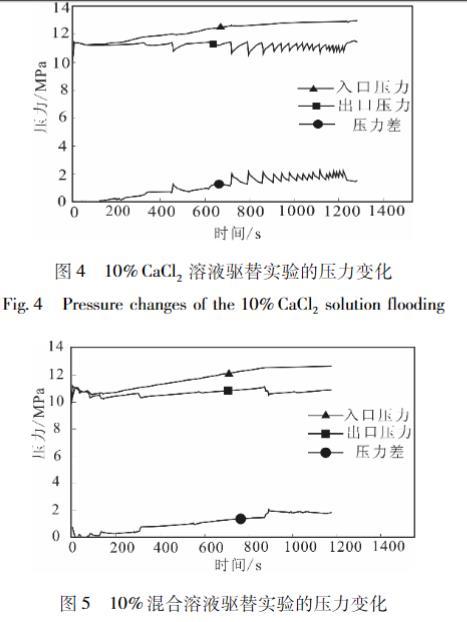 虽然在实验开始前,会通过回压控制装置将压设置在10 MPa,但是在实验过程中岩心夹持度的岩心放器的人口、出口压力会出现波动。通过实验得到通过回岩心夹持器人口、出口压力及二者压力差的变化