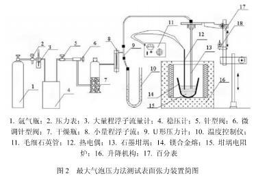 本研究采用“最大气泡压力法”测量阻燃镁合金熔体的表面张力。实验装置见图如图2所示。采用高纯度氩气作为工作气体,干燥瓶中装有CaCl2用于干燥气体,毛细石英管直径为2.86mm,端口经过抛光、清洗处理,U形压力计工作液体为纯净水。
