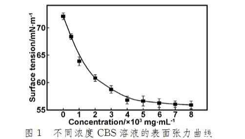 将CBS溶解于蒸馏水中制备4 mg/mL的母液,并稀释至一系列浓度((0~8.0)×10^-3 mg/mL)的样品作为测试液,采用OCAH200表面张力仪测定不同浓度CBS溶液的表面张力,测试温度为20℃。