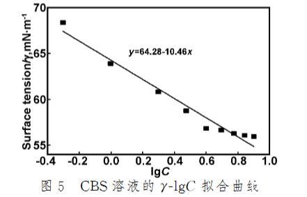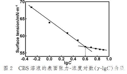 图2为CBS溶液的表面张力-浓度对数(γ-lg C)曲线图。从图2可以看出,CBS溶液的表面张力在浓度对数为0.6时出现转折点,<0.6时,其表面张力随浓度对数的增加而急剧下降;>0.6时,CBS溶液的表面张力随浓度对数的增加而出现平稳状态。因此,根据文献描述的方法,判断该转折点为CBS溶液的临界胶束浓度(CMC)的对数值。结合图1可知,该转折点对应的CBS溶液的浓度为4.0×10^-3 mg/mL,因此判断CBS溶液的临界胶束浓度为4.0×10^-3 mg/mL。在临界胶束浓度以上,CBS分子已经形成有序组合体,溶液表面张力不再随浓度的增大而增大。