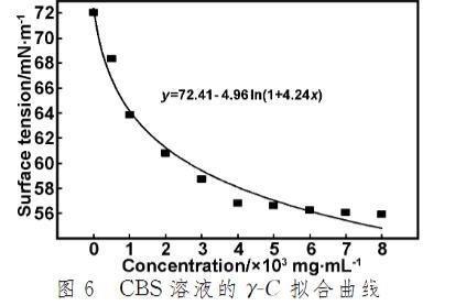 (1)CBS溶液的表面张力随浓度的增大而降低,最后趋于平缓,此时表面张力为55.92 mN/m,并得出其临界胶束浓度为4.0×10^-3 mg/mL。