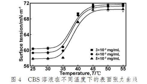 (3)CBS溶液的表面张力随温度的升高呈现两种状态。在低温下,保持较好的表面活性,当温度升高到一定程度(>35℃),由于变性作用,使得CBS的表面张力急剧增大。