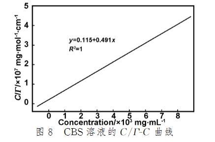 式(2)中,r为Gibbs吸附量,rm为饱和吸附量,C为溶质浓度,k为吸附常数。以C/r对C作图应得到一条直线,其斜率倒数即为饱和吸附量rm。图8即为CBS溶液的C/r-C图。从图8可以计算出CBS溶液的饱和吸附量为2.03×10^-10 mol/cm^2,这与γ-lg C和r-C两种曲线拟合的结果基本相等。