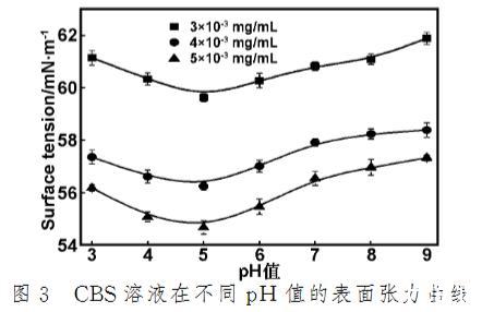 Terashima等发现腐殖酸的平衡表面张力随其溶液pH值的增大而向低浓度方向移动。Jeong等人考察含羞草种子蛋白提取液在不同pH值条件下的表面张力时,发现其表面张力分别在4.0、7.0和9.0时出现最低值。图3即为CBS溶液在不同pH值条件下的表面张力曲线。从图3可以看出浓度越大,表面张力值越低;随着pH值的增大,CBS溶液的表面张力先降低而后增加;在pH值5.0时表面张力最小,分别为59.63(3.0×10^-3 mg/mL)、56.24(4.0×10^-3 mg/mL)和54.27 mN/m(5.0×10^-3 mg/mL)。Lin等认为明胶衍生物在酸性中的表面活性比碱性好的原因是疏水性增强以及净负电荷降低造成的。此外,Lambert等在研究pH值对β-葡糖苷酶的表面张力的影响时,结果表明其表面张力值在pH值3.5时最小,与其等电点相近。CBS的等电点为4.93,因此,在pH值为5.0时,CBS分子聚集成有序的分子组合,且静电荷最低,最终导致表面张力最低。