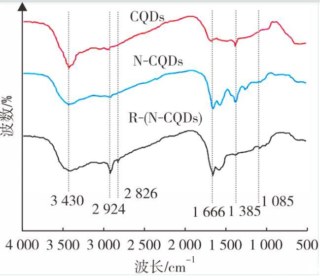 图2是CQDs、N-CQDs与R-(N-CQDs)的红外吸收光谱,在3 430 cm-1处的吸收峰是O-H和N-H伸缩振动,相比于N-CQDs,R-(N-CQDs)在此处的吸收峰较弱,说明在N-CQDs基础上发生了一定程度的烷基化反应,而CQDs在此处的峰比N-CQDs与R-(N-CQDs)的峰要窄,因为CQDs上只存在O-H的伸缩振动,在2 924 cm-1和2 824 cm-1处的吸收峰是C-H的伸缩振动,R-(N-CQDs)在此处的吸收峰比N-CQDs的要强。1 660 cm-1处的吸收峰对应于酰胺基团C=O键的拉伸振动,1 385 cm-1处的峰为C-O伸缩振动,1 085 cm-1处的峰为胺类烷基的C-N振动,R-(N-CQDs)在此处的峰较N-CQDs更为明显,而CQDs在此处看不到任何吸收峰,进一步说明在R-(N-CQDs)在N-CQDs的基础上完成烷基化改性成功引入碳长链。图2表明实现了将氮原子掺杂到碳量子点中的目标,并且在此基础上引入了碳长链对其进行表面修饰。