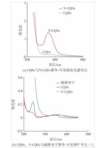 图4(a)是CQDs与N-CQDs的紫外-可见吸收光谱。与CQDs的吸收光谱相比,N-CQDs在波长为350 nm处有一个明显的吸收峰,这是酰胺基团中的C=O的n→π跃迁所致,在长波段方向出现吸收带。这也表明氮原子已被成功引入碳量子点中。图4(b)是以参比法计算荧光量子产率CQDs和N-CQDs以及硫酸奎宁的紫外吸收光谱对比,从图4(b)可以看出,三者吸光度在波长为300~400 nm区间内基本接近,且数值上没有超过0.05,满足量子产率计算条件要求,可以此浓度为基础计算荧光量子产率。