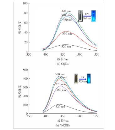 图5是CQDs、N-CQDs及硫酸奎宁的紫外-可见吸收光谱接近且小于0.05(图4(b))时在不同激发波长下的荧光发射光谱,由于硫酸奎宁是以此参比法作为已知条件用于计算碳量子点的荧光强度,所以本研究不涉及硫酸奎宁的光谱法。由图5可知,当激发波长为320~380 nm时,CQDs和N-CQDs都具有一定的荧光强度数值,说明两者都具有明显的荧光性质。图5(a)和图5(b)中插图是两者的水溶液及其在365 nm激发波长下显现蓝色荧光状态,这也能反映出制备的两者具备明显的荧光性质。此外,CQDs的最大发射波长为451 nm,最大激发波长为370 nm;而N-CQDs的最大发射波长为446 nm,最大激发波长为360 nm,说明掺氮对碳量子点的电子环境产生了部分影响,调整了碳量子点的能带结构并改变了碳量子点的表面态,从而使激发波长和发射波长都发生了改变。