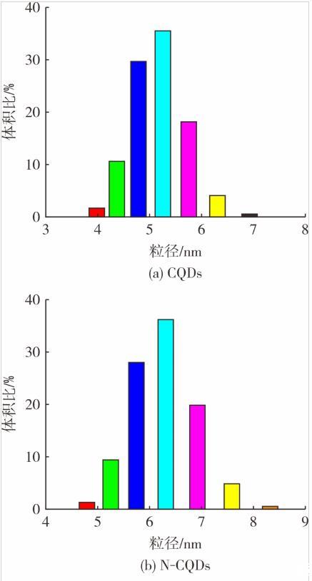 图3是CQDs和N-CQDs的粒径分布直方图。由图3可知,两种碳量子点的粒径分布都比较均匀,CQDs粒径集中分布在(5.25±0.5)nm,N-CQDs粒径集中分布在(6.31±0.5)nm,且都在10 nm以下,符合碳量子点的粒径特征。此外,N-CQDs的粒径整体略大于CQDs,可能是由于氮原子的掺杂打破了碳量子点的完整晶格结构,导致碳量子点发生晶格畸变和扭曲,进而影响形成的碳量子点的粒径。