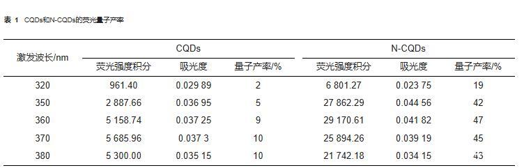 对图5中不同激发波长下CQDs和N-CQDs的荧光发射光谱计算荧光积分强度后计算不同激发波长下的荧光量子产率(硫酸奎宁在313 nm激发波长下的荧光强度积分为22 860.61,吸光度为0.028 63),结果见表1。