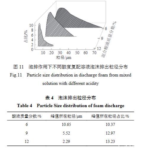 结合泡排作用下泡沫酸起泡效果与泡沫酸润湿携带效果,优选出QPJ-02酸液为效果最好的泡排复配溶液。图11为QPJ-02质量分数为0.6%时,复配不同浓度酸液后泡沫排出粒径分布。由图11可知,酸液浓度越高,泡排作用下排出无机矿物粒径越小,粒径范围越小。当混合酸液质量分数为6%时,无机矿物排出粒径最高为10.65μm,约为酸液质量分数为12%时无机矿物排出粒径的4.65倍,为酸液质量分数为9%时无机矿物排出粒径的2.41倍。这是由于酸液对无机矿物表面的刻蚀削减作用,而无机矿物粒径越小,越易被泡沫携带出煤层气井,因此注气泡排作用下结合泡沫酸的润湿携带效果与酸液的溶蚀效果对于低产煤层气井无机矿物的解堵增渗是十分重要的。