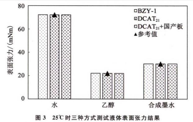使用BZY-1表面张力仪(原配国产铂金板)、表面张力仪(原配进口铂金板)和表面张力仪(选配国产铂金板)对水、无水乙醇、合成墨水进行表面张力测试,测试结果如图3所示。