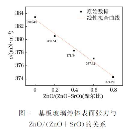 4) 随着 ZnO/(ZnO+SrO) 的增加,锌氧六面体 [ZnO₆] 的断网作用使得 OLED 基板玻璃表面张力呈线性下降趋势,符合加和性法则,关系式为 γ=383–10×W_{ZnO/(ZnO+SrO)}。