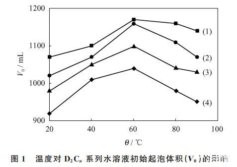 图1 温度对 D2Cn 系列水溶液初始起泡体积(V0)的影响