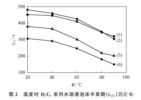 图2 温度对D2C系列水溶液泡沫半衰期(t1/2)的影响