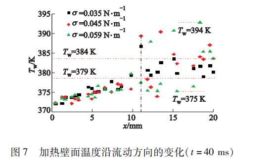 图7加热壁面温度沿流动方向的变化(t=40 ms)
