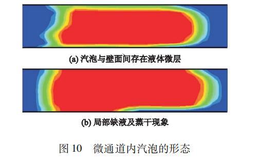 图10a中汽泡与加热壁面间存在一定厚度的液体微层,由壁面导出的热量使微层内的液体迅速汽化,吸收汽化潜热,实现热质的快速迁移。因此,壁面不会出现局部异常过热(图9d中III处);图10b则不同,汽泡与壁面间的液体微层不连续,局部出现缺液,发生干涸,汽相充斥于壁面附近,近壁区传热热阻显著增加,导致壁面热量难以转移,壁温迅速升高,以局部干涸点处的壁温为温度最高点,向邻近区域发生热量扩散,形成图9d中I,II处的温度梯度。比较发现:相对于σ为0.059 N·m⁻¹,σ为0.035 N·m⁻¹时微通道内的局部异常过热区域减少约3/4,最高过热温差ΔT降低约600 K,换热更可靠、安全。
