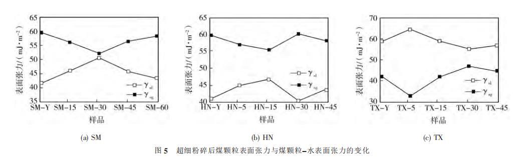 图5超细粉碎后煤颗粒表面张力与煤颗粒-水表面张力的变化