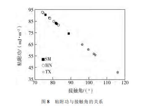 将接触角θ与γlg代入式(9)可得煤颗粒与水的粘附功,结果见图7。由图可知,随着超细粉碎时间的延长,煤-水体系的粘附功的变化趋势与接触角的变化趋势相反。3种煤样的接触角与粘附功的关系见图8。由图可知,随着接触角的增大,煤-水界面的粘附功减小,说明粘附功越小,煤颗粒的润湿性越差。粘附功也可作为衡量煤颗粒润湿性的指标。