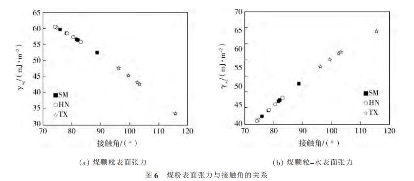 2)随着变质程度的增加,煤颗粒的表面张力减小;随着煤颗粒粒度的减小,不同变质程度煤样的表面张力与接触角呈负相关,煤-水界面张力与接触角呈正相关;接触角增大,煤颗粒表面张力减小,煤-水界面张力增大。