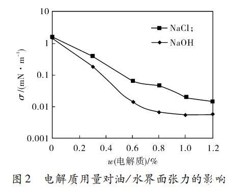NaOH加入到HABS体系中相当于加入了电解质,因此,体系中的NaOH除了发挥碱的作用以外还具有普通电解质的作用。为了考察NaOH的电解质作用,采用与NaOH质量分数相同的NaCl作对比,考察NaCl对正壬烷/水界面张力的影响,实验结果见图2。