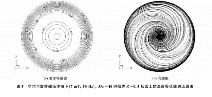 在外加二极对非均匀旋转磁场(7 mT、50 Hz)作用下,浮区液桥失稳后的三维非轴对称的对流特性得到有效地改善。图5为二极对非均匀旋转磁场作用下,Ma=40时的半浮区液桥在Z=0。5H切面上的温度等值线和流线图。从5(a)中可以看出,二极对非均匀旋转磁场的周向搅拌作用下,熔体Z=0。5H切面上的温度以中心轴为中心呈现出明显的轴对称分布特性;熔体在Z=0。5H切面上由液桥中心向自由表面流动,形成周向涡流结构,如图5(b)所示。研究结果表明,二极对非均匀旋转磁场的周向搅拌作用下,Ma=40时熔体的三维非轴对称表面张力对流得到有效地控制,此时二维轴对称流动特性明显。