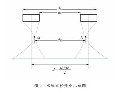 图5给出了水膜直径变小示意图。吊环拉出的水膜,其内表面、外表面都是双曲面,但不对称。一般而言,外表面的曲率半径较小,而内表面的曲率半径较大,2个曲面顶点处的位置(图5中M和N所示)将偏离吊环内、外径的平均值d̄=(d1+d2)/2,如图5中的竖直虚线所示。所以水膜断裂处的直径d断,将小于吊环的d̄,即d断 < d̄。由表2数据可以看出,随着吊环直径的减小,对应水膜的内、外曲面的不对称程度增加,断裂处水膜直径的收缩程度("颈缩")增大,所以2个直径的比值d断/d̄变小。