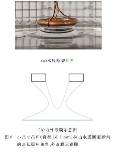 经过对比标准环(d̄=34.03 mm)与自制环(d̄=40.1 mm)拉出的水膜在断裂处的圆周直径相较于吊环直径明显变小。经过测量,标准环对应的水膜断裂处直径为33.1 mm。同样对于自制环水膜断裂处的直径也都减小。如表2所示,对于直径为33.4 mm和18.1 mm的吊环,水膜最细处直径是对应吊环直径的93%和79%。可以看出,随着自制环直径的减小,水膜断裂时的直径减小程度逐渐增大。