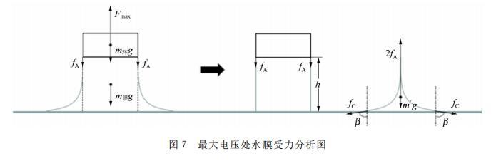 采用隔离法,对电压最大值处的水膜进行受力分析。图7中虚线将水膜分成2部分,吊环正下方的水膜由于水分子相互吸引力附加在拉力Fmax中,而另一部分水膜的重力m′g,与2fA以及水膜与液面处的表面张力2fCcosβ,三者形成平衡状态,即受力分析与水膜断裂时[图1(d)]m2的受力相似。所以计算水膜的重力仅仅需要考虑吊环正下方的重力即可。另外,电压最大值处的水膜稳定性最好,拉升高度h容易测量。对于尺寸较小的吊环(πd̄=78.2 mm),电压最大值处,水膜的内表面没有连接在一起,仍然与液体表面接触良好,所以测量的误差也较小(Eα1=3.9%)。但是对于特别小的吊环(πd̄=57.4 mm),水膜的内表面连接在一起,其表面张力系数明显偏小。