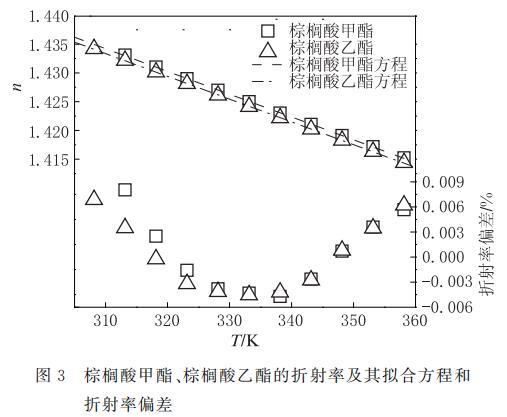 图3 棕榈酸甲酯、棕榈酸乙酯的折射率及其与方程(4)计算值的偏差