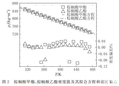 图2 棕榈酸甲酯、棕榈酸乙酯的密度及其与方程(2)计算值的偏差