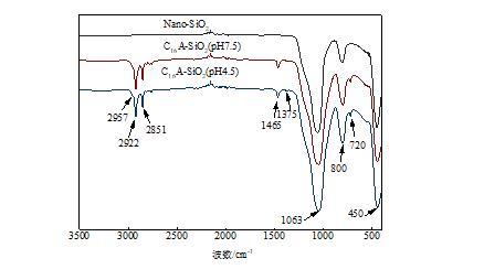 图1为 Nano-SiO2、 C16A-SiO2(pH4.5)、C16A-SiO2(pH7.5)的 FTIR谱图。