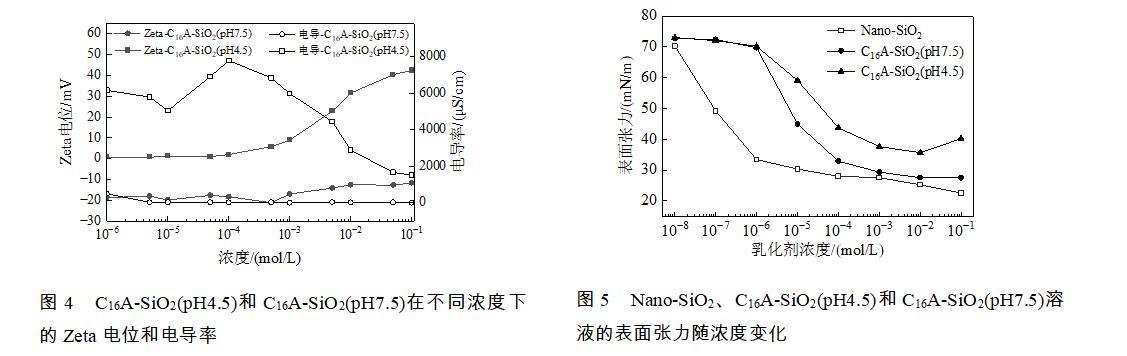 图4 C16A-SiO2(pH4.5)和C16A-SiO2(pH7.5)在不同浓度下的Zeta电位和电导率