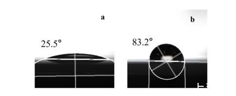 图3 Nano-SiO2(a)和C16A-SiO2(pH4.5)(b)的接触角表征