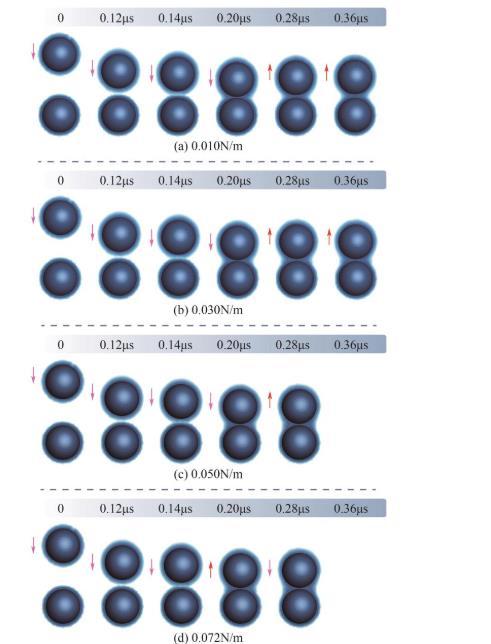 针对表面液膜厚度为0.15Rp、碰撞初速度为10m/s、表面张力系数为0.01~0.072N/m的湿颗粒碰撞过程进行了详细的数值模拟。如图5所示,不同表面张力系数影响了液桥形态的演化规律。在0.14μs时,具有不同表面张力的湿颗粒同时接触液膜,随后在液体分子相互作用力的推动下,液膜流动迅速并填充进颗粒间的间隙,形成稳定的液桥。碰撞后,颗粒1反弹向上,拉伸液桥使其变高变细,最终颗粒上升到最高点时,动能被完全消耗,被液桥重新拉回液膜表面,实现两颗粒的聚并。当表面张力系数为0.01N/m时,颗粒向上反弹的高度更加明显,回落后与下方颗粒再次碰触反弹,最终在0.46μs时聚并。随着表面张力的增加,颗粒反弹时的速度衰减更快,液桥更快地将其拉回液膜表面。