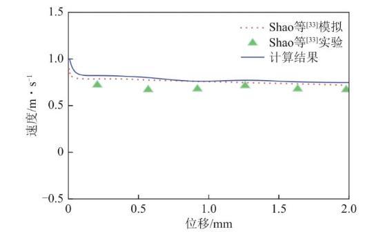 图4 颗粒速度-位移曲线的实验与模拟结果