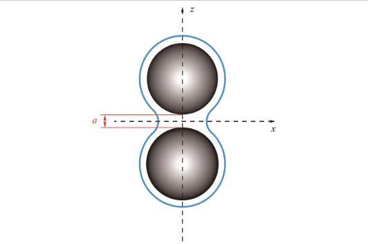 图3说明了两个相同球形颗粒之间的液桥结构,液桥力是由于颗粒间存在液体桥而产生的吸引力,主要由毛细力和表面张力组成。毛细力包括液桥内外的压力差和液体表面张力在接触角处产生的吸引力,而表面张力在液桥表面产生环向力,将颗粒拉近。液桥高度用两颗粒之间的分离距离a(μm)表示。