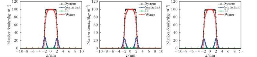 图4 不同复配体系下z轴方向的数密度分布