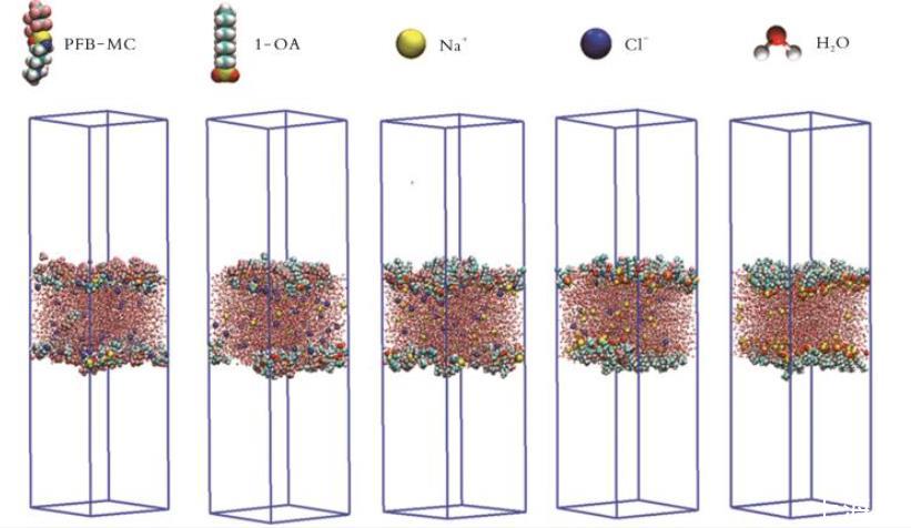 MD模拟在原子尺度解析短链氟碳复配体系(如阴/阳离子型、氟碳/碳氢混合型)的多组分协同机制方面具有独特优势,能定量揭示界面分子排布、相互作用及微观⁃宏观关联。图8为不同n(PFB⁃MC)/n(1⁃OA)复配体系的最终MD模拟模型。