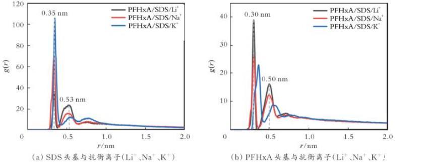 X.L.QUAN等利用全原子模型(CHARMM力场)结合多尺度分析(密度分布、RDF、SASA),定量揭示了阴/阳离子表面活性剂在气⁃液界面的协同机制。结果表明,静电互补(-SO/-NH+)驱动n(PFB⁃MC)/n(1⁃OA)=1∶1的复配体系,可形成致密单分子膜,显著降低表面张力至28.0 mN/m(降幅>30%);n(PFB⁃MC)/n(1⁃OA)=1∶1的复配体系中抗衡离子实现了均匀分散,且1⁃OA具有强氢键能力;通过动态可视化技术可揭示非等物质的量比下抗衡离子的竞争吸附行为,且可阐明比例调控机制。该研究可为环保短氟碳灭火剂设计提供原子尺度依据,指导复配比例优化。