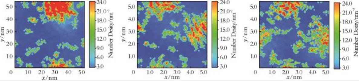 对界面微观结构与形貌的可视化分析(包括轨迹快照、二维密度俯视图)可提供分子构象、排列及聚集状态的直观图像,辅以界面涨落分析及团簇分析,可有效探测界面在横向(x⁃y平面)的均质性、微相分离现象(如氟碳/氢碳富集区)、微小聚集体(如半胶束)的形成以及界面粗糙度。图6为x⁃y平面内表面活性剂分子的二维数密度分布图。