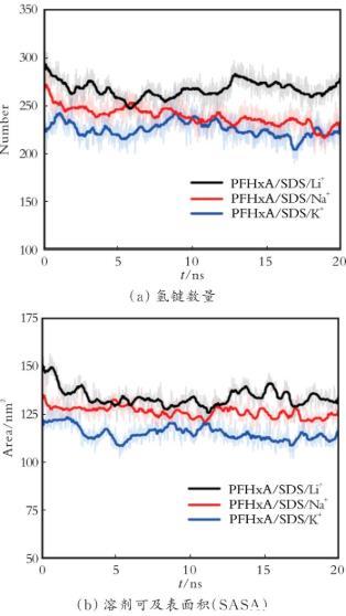 图4为不同复配体系下z轴方向的数密度分布。由图4可知,沿z轴的数密度分布可清晰界定气相、界面区与液相的位置及界面厚度。通过该分析能直观地揭示氟碳链、氢碳链、水分子及各复配组分在界面区域的富集程度、分布轮廓及其与纯体系的差异,不同原子/基团(如极性头基与疏水尾链)在z轴上的位置偏移间接反映分子的取向偏好。