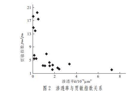 可驱替一段时间后,渗流通道中产生的油滴(柱)在运移过程中又会产生更大的附加阻力[由公式(1)可得,当渗流通道的尺寸级别变小后,附加阻力变大],使得注入水无法顺利通过渗流通道,此时只有增大注入压力,注入水才可以继续驱替。这样不断循环之后,注入压力越来越大,最终将可能发生压力源无法达到所需的注入压力或岩石破裂而发生水窜。而且在油田实际生产过程中,注入压力通常为恒定值,因此,无法通过不断提高注入压力来克服贾敏效应所产生的附加阻力,所以,油滴(柱)无法通过喉道窄口处,这就是贾敏效应产生作用的典型后果。③渗透率越低,I越大,贾敏效应越突出。通过贾敏实验所测得20块岩心的I与岩心渗透率的关系图(图2)可以看出,普遍呈现渗透率越低,I越大的关系。