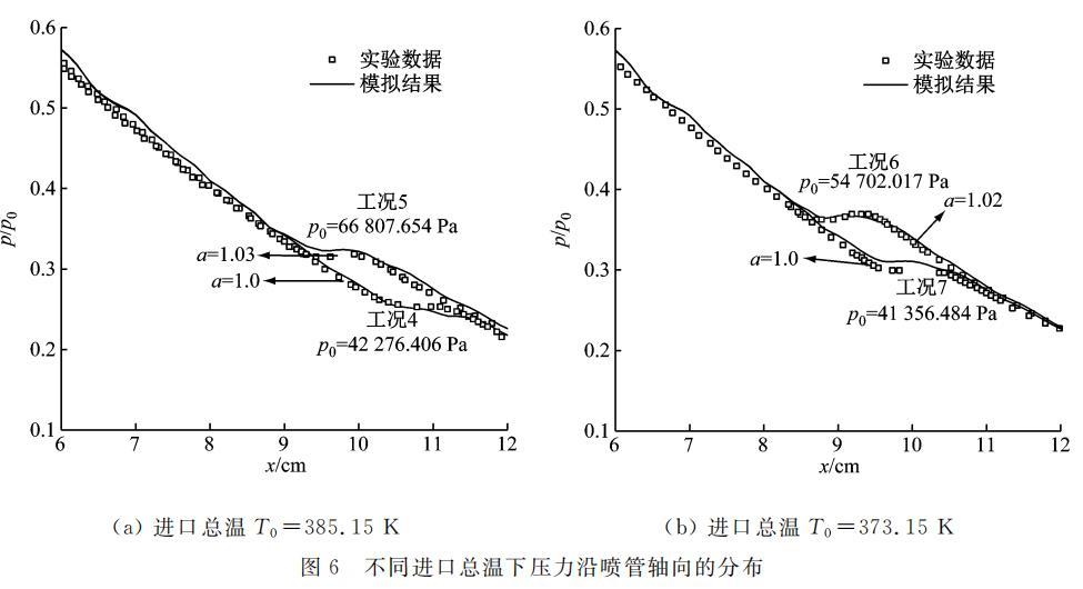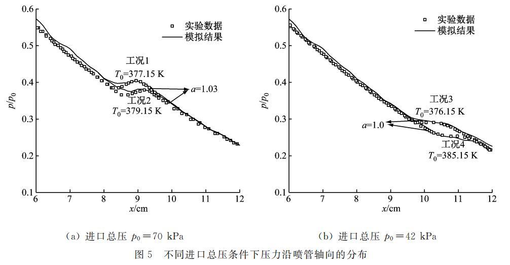 图 5 给出了进口总压为 70 kPa 和 42 kPa 条件下,蒸汽压力沿喷管的轴向分布。由图 5(a) 可知,a=1.03 时,工况 1、工况 2 模拟得出的压力分布与实验数据基本吻合。与图 5(a) 相似,图 5(b) 中当 a=1.0 时,均能获得与实验压力分布基本吻合的模拟结果。对比图 5(a) 和图 5(b) 可知,a 的取值与进口总温关联较小,而与总压有明显的相关性。该结论从图 6 中 2 组工况的压力分布曲线可进一步证实。在相同的进口总温下,随着总压的下降,对应的表面张力修正系数最佳取值分别从 1.03 和 1.02 下降到 1.0。对于以上 7 个工况的预测,其蒸汽压力陡升程度与实验数据相吻合,蒸汽凝结位置与实验数据的相对误差也均小于 2%,在可接受范围内。