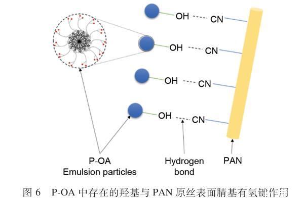 在炭纤维生产过程中油剂是减少表面缺陷的有效措施。本文设计合成的HA-PDMS,分子两端有3个羟基,容易与PAN原丝表面腈基(-CN)形成氢键(图6),有利于增加PAN原丝集束性。对P-PAN和J-PAN的性能进行了测试,由表2可知,P-PAN强度较J-PAN提高4.6%,断裂伸长率、纤度、模量、抗摩擦系数以及变异系数与J-PAN相当。