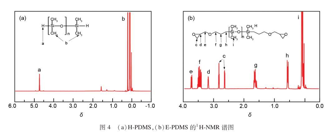利用1H-NMR对H-PDMS和E-PDMS的形成进行结构表征,如图4(a)所示,a处的位移(4.57)归属为Si-H上的氢,b处的位移(0.08)归属为Si-CH3上的氢,证明了H-PDMS已经合成。如图4(b)所示,c、d处的位移(2.61~2.80、3.15)分别归属为环氧基团上的氢,e、f处的位移(3.70、3.36)分别归属为醚键两端的氢,g、h处的位移(1.62、0.57)归属为—CH2—上的氢,i处的位移(0.08)归属于Si-CH3上的氢,证明了E-PDMS已经合成。