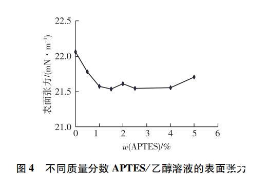 液体对固体粉末粗糙表面的浸润性与溶液的表面张力有关, APTES分子只能在液体与固体粉末接触面积区域内进行分子自组装。图 4是不同质量分数 APTES/乙醇溶液的表面张力。由图 4可见,在质量分数小于 4% 的条件内,不同质量分数 APTES/乙醇溶液与纯乙醇的表面张力相差不大,可以认为绢云母粉末在不同质量分数 APTES/乙醇溶液中的浸润性相当,即在不同质量分数下, APTES与绢云母粉末的接触面积相等。