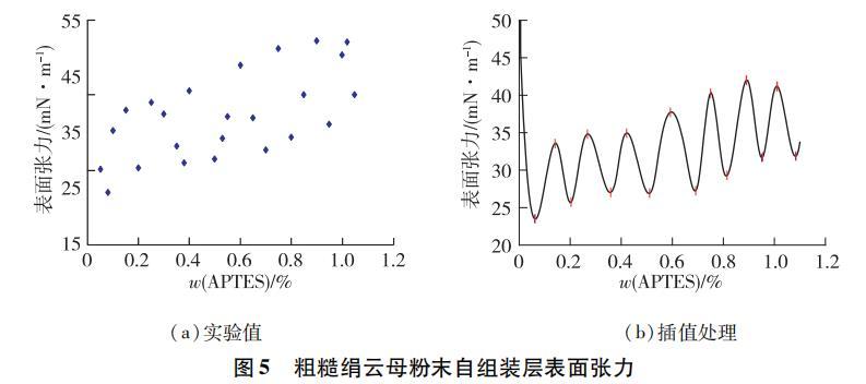 图 5(a)为粗糙绢云母粉末在不同 APTES质量分数下的分子自组装膜的表面张力,图中的数据点表现出周期波动的特点。为了获得该曲线的波峰和波谷,对图5(a)进行插值处理。图5(b)显示在小于1.2%,曲线具有周期性,且波峰与波谷随着 APTES用量的增加而增大。根据图5(b),分别选取峰谷和峰尖的APTES用量及表面张力列入表2。