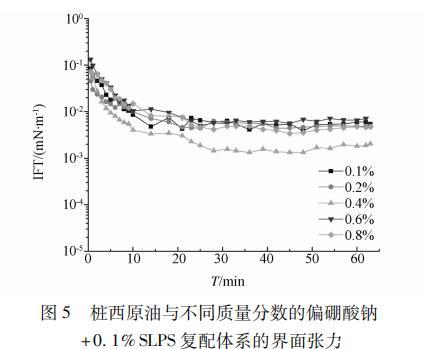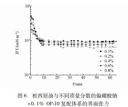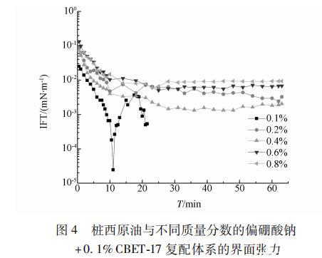 由图4可以看出,偏硼酸钠与CBET-17复配出现了明显的协同效应,获得了超低界面张力,10-3 mN/m低界面张力体系维持的时间较长,0.1%浓度偏硼酸钠在10min时,出现了油丝拉断现象,最低界面张力达到2.5×10-5 mN/m。偏硼酸钠浓度低时,复配体系与原油界面张力较小。偏硼酸钠质量分数为0.4%时,平衡界面张力较低,可达1.9×10-3 mN/m。